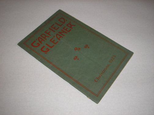 | 10985 | Staff | Garfield Gleaner Christmas, 1923 | Garfield School | Fair. The covers are worn, soiled and stained and have a vertical crease. The front cover has a 1 inch rip on the spine. Both the covers and pages have creasing and "rumpling" and soiling. Staples are rusty. The previous owner's name is in ink on the front cover. There are two pages of autographs in the back. | 1923 stapled paperback, 7 x 10.5 inches, with 33 pages and b&w photos. Garfield School, Berkeley California, yearbook. | Garfield School, Berkeley, California, yearbook. | $30 |