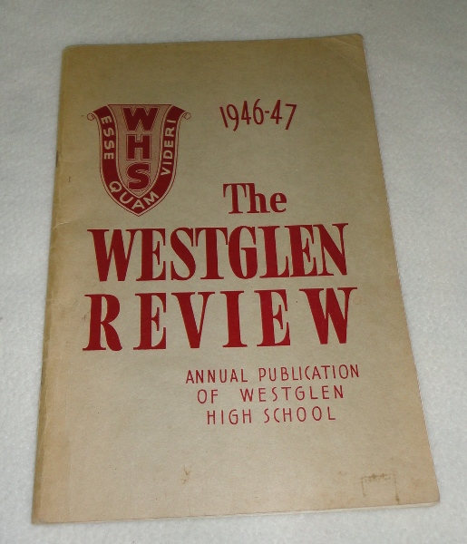 | 12344 | Miller, Helen | The Westglen Review Annual Publication of Westglen High School 1946 - 47 | Annual Staff | Good. Some shelf wear and soiling on the covers. There are no autographs or writing. | 6 x 9 inches stapled paperback with many photos and interesting ads. High School Yearbook for Westglen High School, Edmonton, Alberta | Edmonton, Alberta, Canada, Westglen High School Yearbook | $20 |
