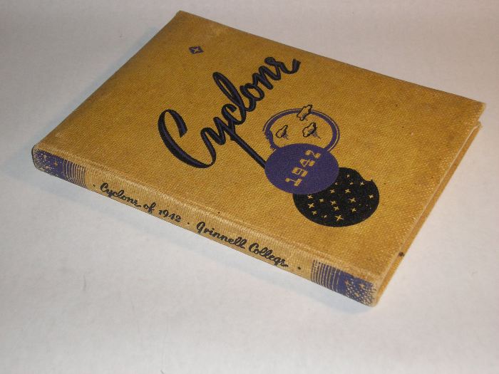 | 12986 | Bennett, Florence, Editor | Cyclone 1942 | Grinnell College | Good. Covers are a little discolored. Owner's name in ink. No autographing or marks. No dust wrapper. | 8 x 11 inches, with many b&w photos, ads and an index, 1942 yearbook for Grinell College, Grinell, Iowa | College yearbook, Grinell, Iowa | $25 |