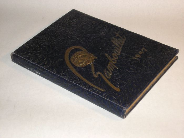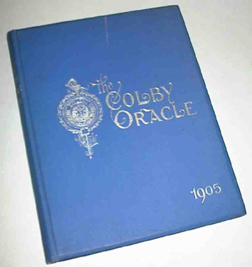 | 9901 | Clark, Cecil W. editor | The Colby Oracle 1905 | Colby College | Good. Covers shelf worn and soiled. Top and bottom of the spine are shelf worn. One scrape mark on the front cover. Back hinge has a 1.5 inch long hole from insects. No dust wrapper. There is no ink inside. Contents are very good. | 1905 7x9 inches hardback with 170 pages, b&w photos, illustrations, 32 pages of ads. Colby College, Waterville, Maine | College Yearbook,Colby College, Waterville, Maine | $25 |