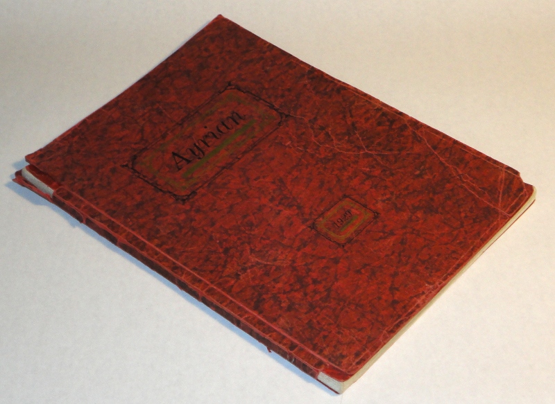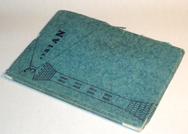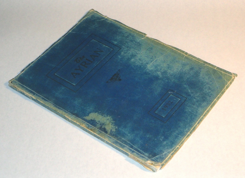 | 13504 | Mosier, Arlo, editor | Ayrian Volume III 1929 | Mount Ayr High School | Fair to good. The binding is fragile, torn and chipped. There is some soiling inside. The contents are good. There are a few autographs | 8 x 10.5 Mount Ayr, Iowa yearbook with many b&w photos and a lot of advertisements. | Mount Ayr, Iowa, high school yearbook | $30 |