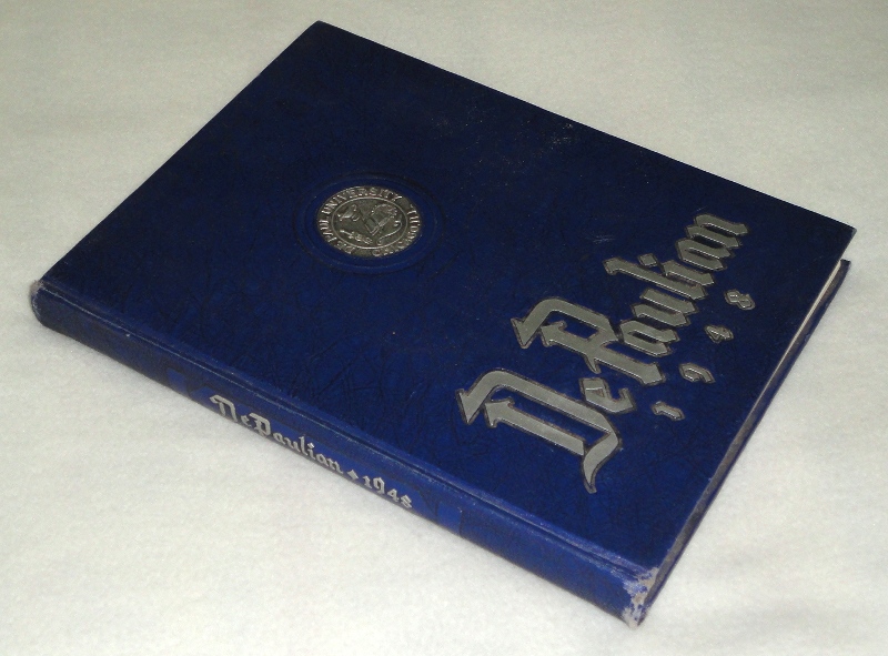 | 13585 | Staff | DePaulion 1948 | DePaul University | Good. The covers have wear and soiling. The bottom of the spine is frayed. Pages have moisture marks on the edges. | College yearbook for DePaul University in 1948. There are many b&w photos. | DePaulion, DePaul University, yearbook, Chicago, Illinois | $25 |