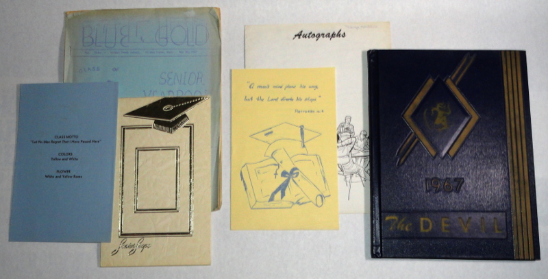 | 15616 | Fiess, Arlene, editor | The Devil Wilson Creek High School Yearbook, 1967 | The Wilson Creek High School Journalism Class | Good. Light shelf wear and soiling. Fading lettering. | High School yearbook for the Wilson Creek High School. Wilson Creek, Washington. B&w photos and ads. Owner's name in ink two times, no other autographs. Also includes a supplement, baccalaureate program, commencement program and Senior Scope. | High School yearbook, Wilson Creek High School, Eastern Washington | $25 |