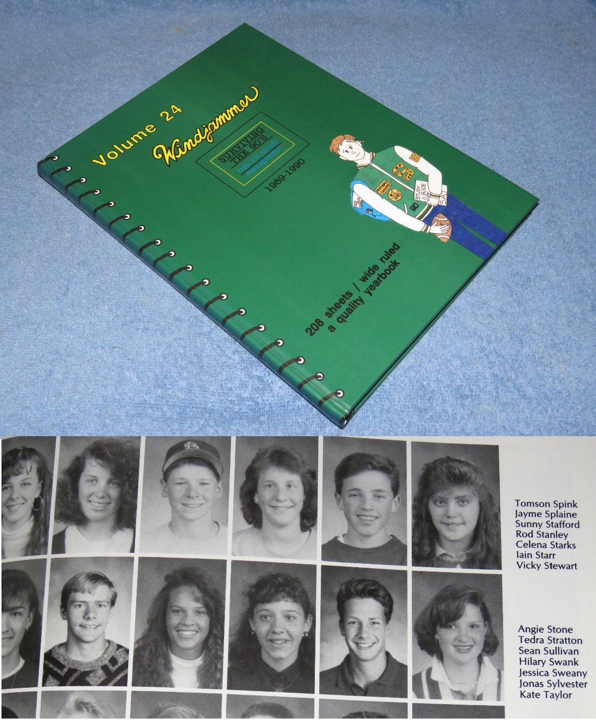 | 17561 | Morse, Cindy and Laura Derleth | Sehome High School 1989-1990 Windjammer Volume 24 | Sehome High School | Good. One 20 page "S" section was missaligned in the manufacturing process. It sticks out 1/4 inch.One name in ink. | 9 x 12 inches with many photos, an advertising section and an index. Hilary Swank is a sophomore and is pictured twice. | Sehome High School, Yearbook, Bellingham, Washington. Hilary Swank | $100 |