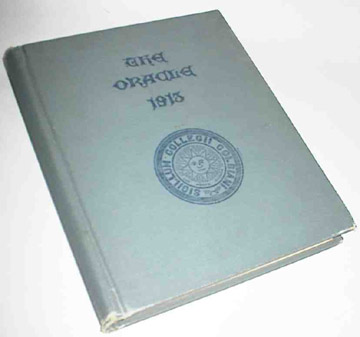 | 9903 | Cleveland, Irvin L., editor | The Colby Oracle 1913 | Colby College | Good. Light shelf wear on all the extremities of covers and spine. Owner's name in ink 2 times inside. No dust wrapper. | 1913 hardback 7x9 inches with 302 pages, b&w photos, illustrations and ads. Colby College, Waterville, Maine | College Yearbook,Colby College, Waterville, Maine | $25 |